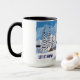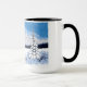 Una taza con una hermosa escena invernal que incluye montañas nevadas, cabaña rústica y pinos cubiertos de nieve. La imagen y el texto se pueden personalizar. Obra original de W.B.