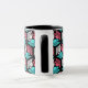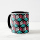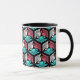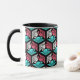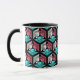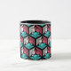 Mug en un clásico patrón de kimono japonés de grúas estilizadas, dispuestas en un patrón de hexágonos, en rosa coral, turquesa y blanco, sobre un fondo negro