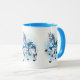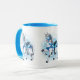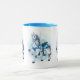 He amado a los carruseles desde que era niño. Los hermosos diseños de los animales y la música de los carruseles instalados en ferias y parques ocupan un lugar especial en mi corazón. Esto me inspiró a dibujar unos caballos de carrusel propios, luego colorearlos con tinta acrílica. La acuarela de un caballo gris decorado en azul que aparece en esta taza es uno de los resultados.