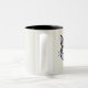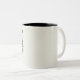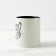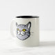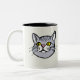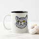 La taza simple del dos-tono con el dibujo de una cabeza gris del gato de tabby con las barbas, plata gris gris rayó la piel rayada del pelo, nariz rosada, blanca dentro de los oídos, y el ámbar amarillo de oro observa.