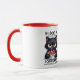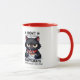 Un gato negro gruñón se aferra a su café matutino, capturando perfectamente el humor de ‘no me hables antes de la cafeína’.