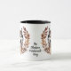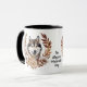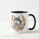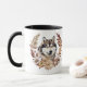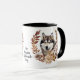 Una corona de otoño de bonito en tonos marrones, canela y crema rodea la imagen acuarela de un hermoso perro malamuta de Alaska. La imagen se imprime dos veces en la taza, con el texto de su personalizado entre ellas.