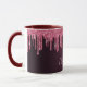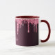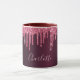 Una taza elegante, glamurosa y femenina. Purpurinas falsos de color rosa oscuro con cerezo gotean. Fondo profundo y oscuro del degradado burdeos morboso. Personalice y agregue un nombre. El nombre está escrito con una escritura de estilo con letras a mano moderna. Letras de color rosa claro.