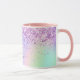 Un fondo holográfico de moda con unicornio y colores pastel arcoiris en rosa, violeta, verde menta. Decorado con confeti. Personalice y agregue un nombre, escrito con un estilo de escritura con letras a mano moderno y con cambios. Letras de color púrpura. Para que los cambios sólo eliminen el nombre del ejemplo, deje los espacios o la emoji delante y después del nombre.