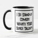 Divertido lema en una taza de café que dice "Yo hago comedia stand-up. ¿Cuál es tu súper talento?". Coffee Mug para un comediante independiente o alguien que sea un comediante. Texto en negrita en blanco y negro.