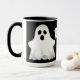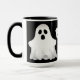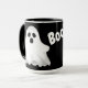 Esta es una taza adorable para Halloween. La imagen muestra fantasmas adorables a cada lado con la palabra "¡Boo!" en la parte delantera de la taza, que se puede personalizar con la propia o la izquierda como está.