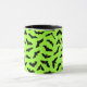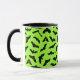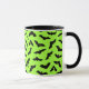 Esta taza presenta un patrón espeluznante de murciélagos negros voladores con ojos amarillos en un fondo color verde lima, la taza perfecta de Halloween para los amantes de los murciélagos.
