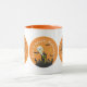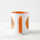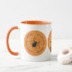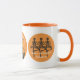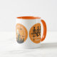Esta taza adorable tiene tres imágenes circulares de una araña viuda negra en una web, un fantasma blanco, murciélagos negros, una casa embrujada y cementerio, y esqueletos bailando en tutus contra los antecedentes de los naranjas, y las palabras Feliz Halloween, Ten un espeluznante Halloween y ten una espeluznante Halloween.