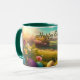 A picturesque spring landscape with rolling hills and blossoming trees stretches out in an idyllic, sunlit valley. A bright white Easter bunny sits attentively in the grass, surrounded by colorful, artfully decorated Easter eggs. The flowers in vibrant colors and the warm golden light of the setting sun lend the scene a peaceful and festive atmosphere. The elegant lettering "Happy Easter" hovers above the scene, underlining the festive mood.