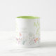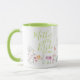 Un regalo especial para la madre de la novia, la taza cuenta con un jardín de flores silvestres en acuarela con "madre de la novia" en una tipografía elegante manuscrita en un verde suave que coincide con el interior y el asa. Personaliza con la fecha de tu boda.