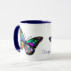 Aquí hay una taza colorida y brillante con una hermosa y brillante imagen de mariposa a cada lado. ¡La imagen artística está en múltiples colores: azul, verde, amarillo, rosa, naranja, negro y más! Entre las dos imágenes está tu texto personalizado en azul. ¡Magnífico!