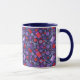 Coffee Mug con adorable patrón, suministros de costura - tijeras, botones, botellas de hilo, agujas - esparcidas en el campo azul oscuro. Este diseño, elaborado a partir de un collage de papel hecho a mano, hace grandes regalos para artesanos y alcantarillas. © Julia Khoroshikh www.juliakhoroshikh.art #coffeetime #giftForrafter #homehobbies #haberdashery