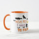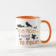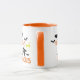 el divertido Costum coffe mug para Halloween presenta un moderno diseño decorativo de naranja y tipografía negra con brujas voladoras y murciélagos alrededor.