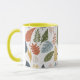 Alegre taza amarilla con colorido patrón de hoja, naranja, verde y azul.