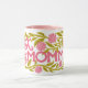 This is a vibrant and floral "Hot Momma" Mother's Day Mug features a wrap-around design with a bold, hand-painted writing, leaves and flowers. This mug is covered in a lush pattern of bright carnations and green foliage.