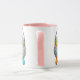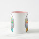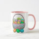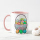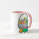 Café con mi diseño de coloridos huevos pintados de Pascua en una canasta de bonito con un cartel que dice "Feliz Pascua".