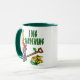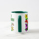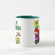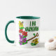 Una taza con el jardinero diciendo "I Dig Gardening", con flores florecientes en rojo, amarillo y morado, una abeja, una perra y una pala está brotando una hoja.