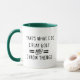 A hunter green ceramic coffee mug with white text that humorously reads, "I Golf & I Know Things."