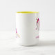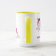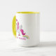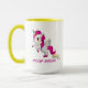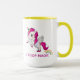 Una taza con un dicho gracioso: Puedo hacer magia. Diseñado con un unicornio alado blanco con mané rosa, cola y pezuñas. El cuerno tiene anillos de color arcoiris y se parece a una golosina de caramelo. Este lindo unicornio está criándose en sus patas traseras. El corazón rosado dulce en la mejilla y las largas pestañas de una niña. Un arco iris junto a la palabra magia.