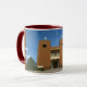 Taza de café de New México con una iglesia hermosa del adobe situada en los Estados Unidos al sudoeste, cerca de Santa Fe. El adobe marrón rico puso en contraste perfectamente con el cielo gloriosamente azul de New México este día.