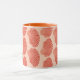 Mug en un patrón de impresión en bloque, basado en una concha de vieiras, en un naranja de coral sobre un fondo de coral pastel