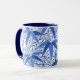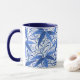 Taza de café en una impresión de William Morris del vintage de las hojas y de los tendrils del bambú, digital aumentada y coloreada en una suavidad, efecto texturizado, en colores pastel del creyón - sombras del azul profundo del azul de cobalto, acentuadas con la marina de guerra/el añil oscuros, sobre un fondo blanco