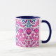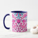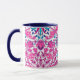 tazón de café con un patrón vintage de William Morris de jacintos, tulipanes y hojas, en tonos fucsia y rosa suave, acentuado con azul oscuro y turquesa, sobre un fondo blanco