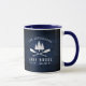 Un hermoso tazón de café de dos tonos con temática rústica, con su nombre familiar y "Lake House" u otro texto deseado junto con su fecha y ubicación establecidas. Este diseño personalizado y único presenta una silueta blanca de remos cruzados y pinos sobre una huella de tablas de madera de colores azules. Para ver más diseños como este, siéntase libre de visitar mi tienda aquí en "Zazzle.com/Rustic_Charm". ¡Gracias.
