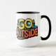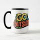 Un ilustracion vibrante y juguetón, exploración motivadora al aire libre. Las palabras "SALIR FUERA" se exhiben de manera destacada con un telón de fondo de colinas verdes, pinos, una bota de senderismo y una mirada de un colorido balón, sugiriendo actividades como senderismo y jugar en la naturaleza.