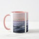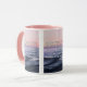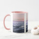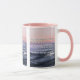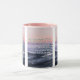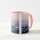 Esta taza de dos tonos tiene un tipo de letra mediana de bolso con letras blancas con un contorno azul marino que muestra el versículo de la biblia "James 5:15" de KJV sobre una imagen de fondo que muestra una vista superior del océano con corrientes bajo un cielo vibrante de color en este tema de la naturaleza. Este verso hace referencia al capítulo 5 del Libro de James que muestra el versículo 15 de esta biblia, cita el tema de la Biblia del Rey James. La llanta y la manecilla están acristaladas con colores a juego disponibles en la construcción de cerámica de microondas y lavavajillas de 11 onzas o 15 onzas.