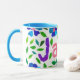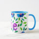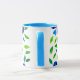 Una taza de ringer blanca con un borde y mango azul en polvo y el nombre de "Jane", rodeada por una salpicadura de hojas y flores, de un diseño de collage de papel pintado a mano de Judy Adamson. También hay disponibles tarjetas de felicitación coincidentes.