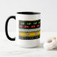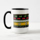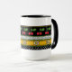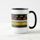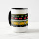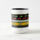 Alegre diseño original con bordes apilados de puntos negros sobre alfileres blancos, puntos blancos sobre polka negros, cerezas rojas con hojas verdes sobre estrellas blancas negras de David delineadas en negro sobre un fondo amarillo desafiante y pinstripes de verde primavera. Mug disponible en 2 tamaños.