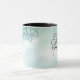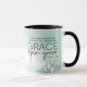 Inspiradora cita escritura tazón de café representa un diseño floral con flores dibujadas a mano simples sobre un fondo abstracto azul y blanco. Presenta la Biblia Verse John 1:16, "Desde su plenitud todos hemos recibido gracia en gracia".