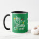 Personalized JOY IN JESUS Christian Christmas Mug in GREEN with bold black script typography and holly. Ideal personalized Family Mug during the festive season, with a strong Christmas message of joy in Jesus all year round. You can PERSONALIZE with your family or group name and year. Matching gifts available. Other colors available.
