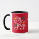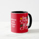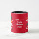 Personalized JOY IN JESUS Christian Christmas Mug in RED with bold white script typography and holly. Ideal personalized Family Mug during the festive season, with a strong Christmas message of joy in Jesus all year round. You can PERSONALIZE with your family or group name and year. Matching gifts available. Other colors available.