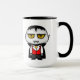 Pequeño personalizado bebé vampiro con grandes ojos de gato amarillo, vestido con un chaleco rojo y una capa negra.