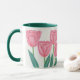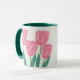 Una pintura acuarela inspirada en tulipanes en vivo de bonito recibidos como regalo. Las flores rosas lisas son elegantes y encantadoras para ver en cualquier habitación. Hace un maravilloso regalo de taza para un miembro de la familia o un amigo.