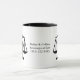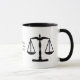 Las escalas de la justicia en un café, de la taza del té en el negro para un abogado, del juez, del paralegal, del taquígrafo de la corte, de cualquier persona en el departamento de justicia o de una persona que trabaja hacia justicia o dar como regalo a los clientes con su información de contacto encendido