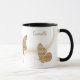 Las imágenes de mariposa de silueta están llenas de hojas de música antiguas en esta taza de bonito. El texto dorado marrón en la parte inferior dice "La música tiene alas", y tu nombre personalizado está en el otro lado. Todo está colocado sobre un fondo blanco, con una sutil estrella dorada girando entre las imágenes de la mariposa. ¡Perfecto para el músico, el profesor de música o cualquiera que ame la música!