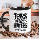 Adoptar una actitud audaz con esta taza personalizada de "Lágrimas de mis odios". Perfecto para cualquiera con un poco de sass, esta taza le permite añadir un nombre personalizado para un toque único. Ideal para los que no se arrepienten, hace un regalo divertido para amigos, compañeros de trabajo o para uno mismo. Ideal para disfrutar de café, té o cualquier bebida favorita con un toque de diversión.