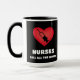 Aquí hay una taza en la que a cualquier enfermera le encantaría tomar su café. Este diseño tiene un corazón rojo con un disparo y un texto que dice "ENFERMEROS LLAMAN A TODOS LOS ZAPATOS". La manija y el interior de la taza son negros.