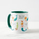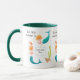 Una taza blanca con el labio de Hunter Green y su mango con sirenas, peces y cangrejo ermitaño, de una pintura acuarela de Judy Adamson. Puede agregar el nombre del propietario de la taza en el cuadro que tienen las sirenas. También hay disponibles tarjetas de felicitación y regalos a juego.
