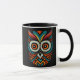 Se trata de un búho decorativo hecho a mano y estilizado con motivos aztecos en tonos negros, rojos, turquesa y naranja.