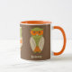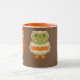 Beba tu café recién hecho en un estilo retro con esta taza de café personalizada que presenta adorables ilustraciones de lechuzas de estilo vintage en naranja, crema y verde aguacate con un fondo marrón.