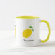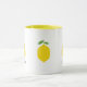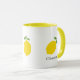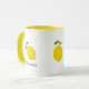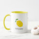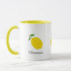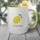 Una taza con un ilustracion de limón amarillo y texto de personalizable: regalo perfecto para los amantes del cítrico. Se podría usar en casa, en la escuela o en el trabajo.