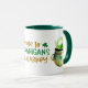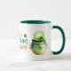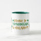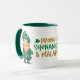 ¡Aquí hay una taza de diversión para el Día de San Patricio, o solamente para cualquiera que esté orgulloso de irlandés! El texto estilizado en el centro dice "Propenso a Shenanigans & Malarkey" en oro y verde, con dos shamrock. A un lado del texto hay un gracioso leprechaun gnome rojo con barba vestido de verde. ¡Al otro lado está la olla de oro!