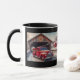 Mug presentando la obra de arte de Rick Ellinger sobre Little Red Truck AI. Pequeño Camión Rojo, Puente Cubierto e Iglesia del País con Poinsettias.