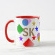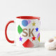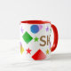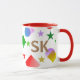 The cheerful personalized coffee mug boasts a vibrant and lively geometric design featuring stars, squares, and circles in bright colors such as golden yellow, red, green, blue, pink, and purple. This custom mug offers the option to personalize it with an initial or other text in a striking golden yellow. Whether you choose to keep the classic red mug or switch to green, blue, or black, it is sure to brighten your coffee or milk-drinking moments! A delightful choice for both kids and adults, this fun mug adds a touch of joy to any beverage.