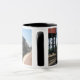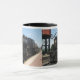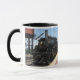 Esto es una taza de café que ofrece una fotografía original de un negro, locomotora de vapor.