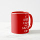 Haga que sus los propios guardan las tazas tranquilas con esta plantilla adaptable. Tiene una imagen de un estetoscopio en vez del logotipo de la corona. Dice guarda calma y cuida encendido en un fondo rojo como el poster original.